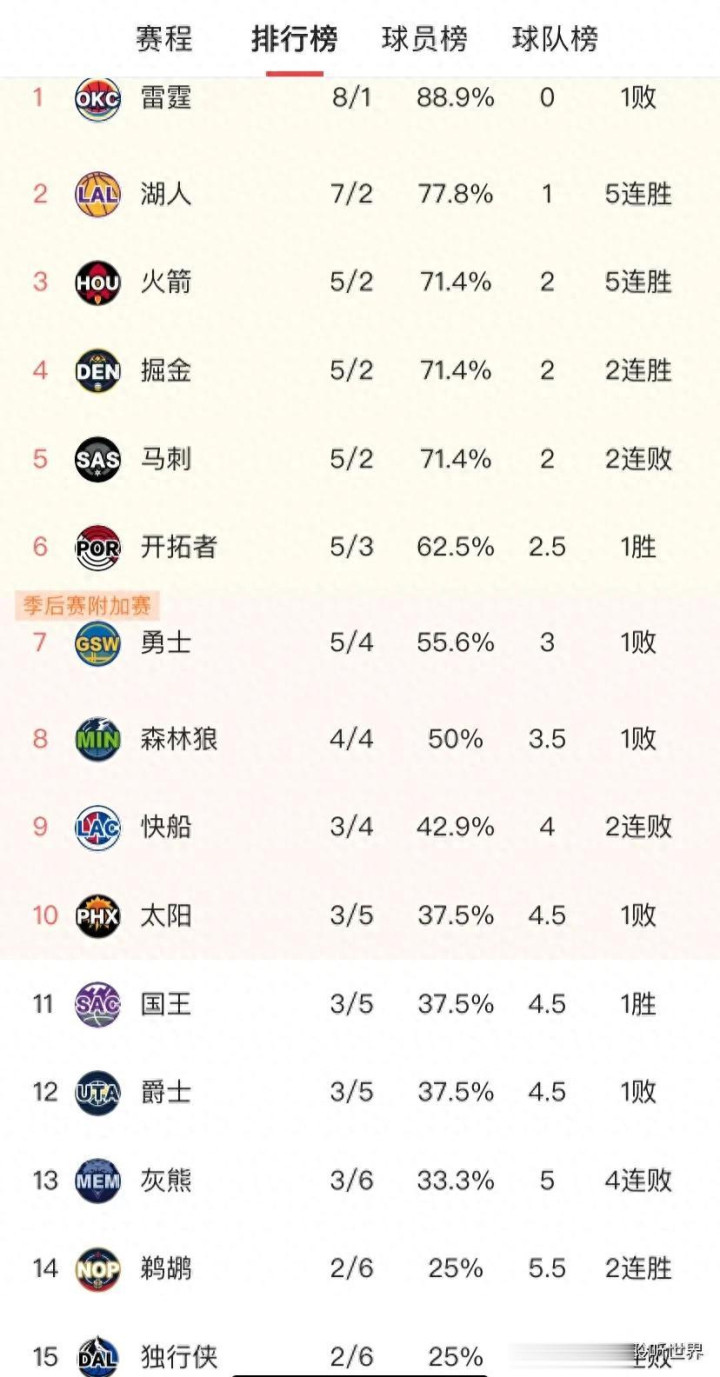 此战之后,雷霆8胜1负排在西部第1名,开拓者5胜3负排在第6名。